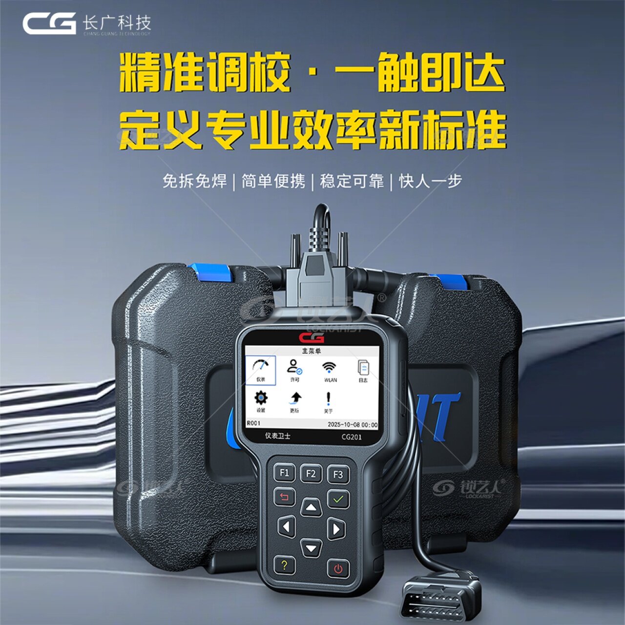 CG201 OBD 仪表调校编程器,免拆免焊、简单便携,支持精准里程校正与仪表系统编程,覆盖多品牌车型且无年费,是锁匠开展汽车相关服务的实用工具。 CG201 是长广科技推出的智能 OBD 仪表调校编程器,免拆免焊、简单便携,无需年费。具备精准调校性能,采用高精度解码芯片保障安全可靠;支持仪表盘里程校正,操作简单数据准确;可通过 WIFI 和 USB 实时更新数据,覆盖大众、奥迪、奔驰等众多车系,是汽车仪表调校与编程的实用工具。