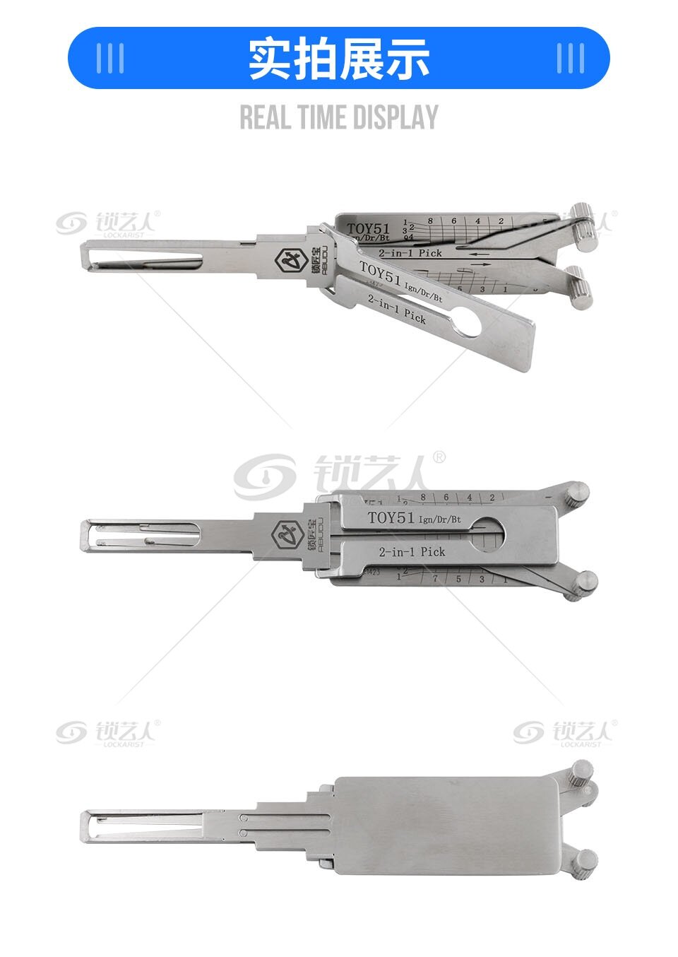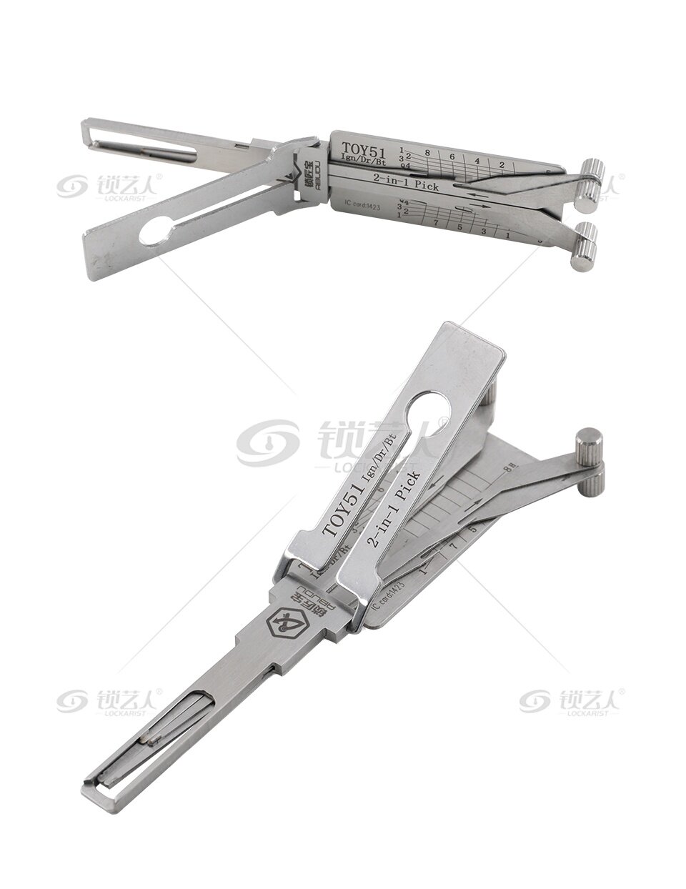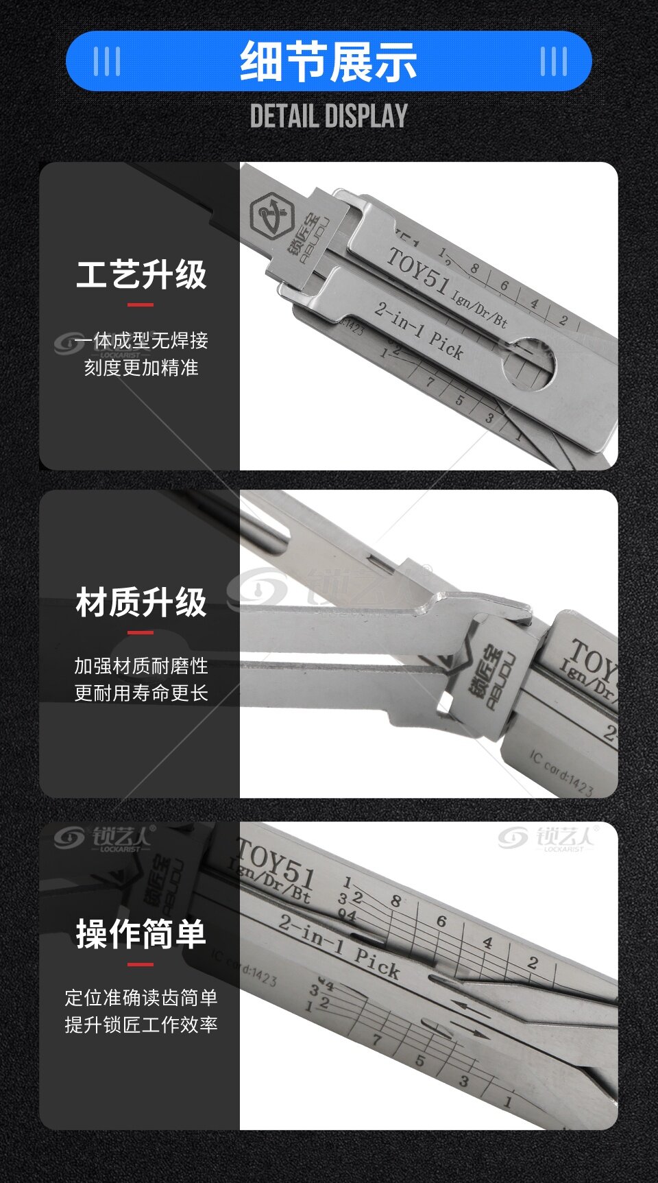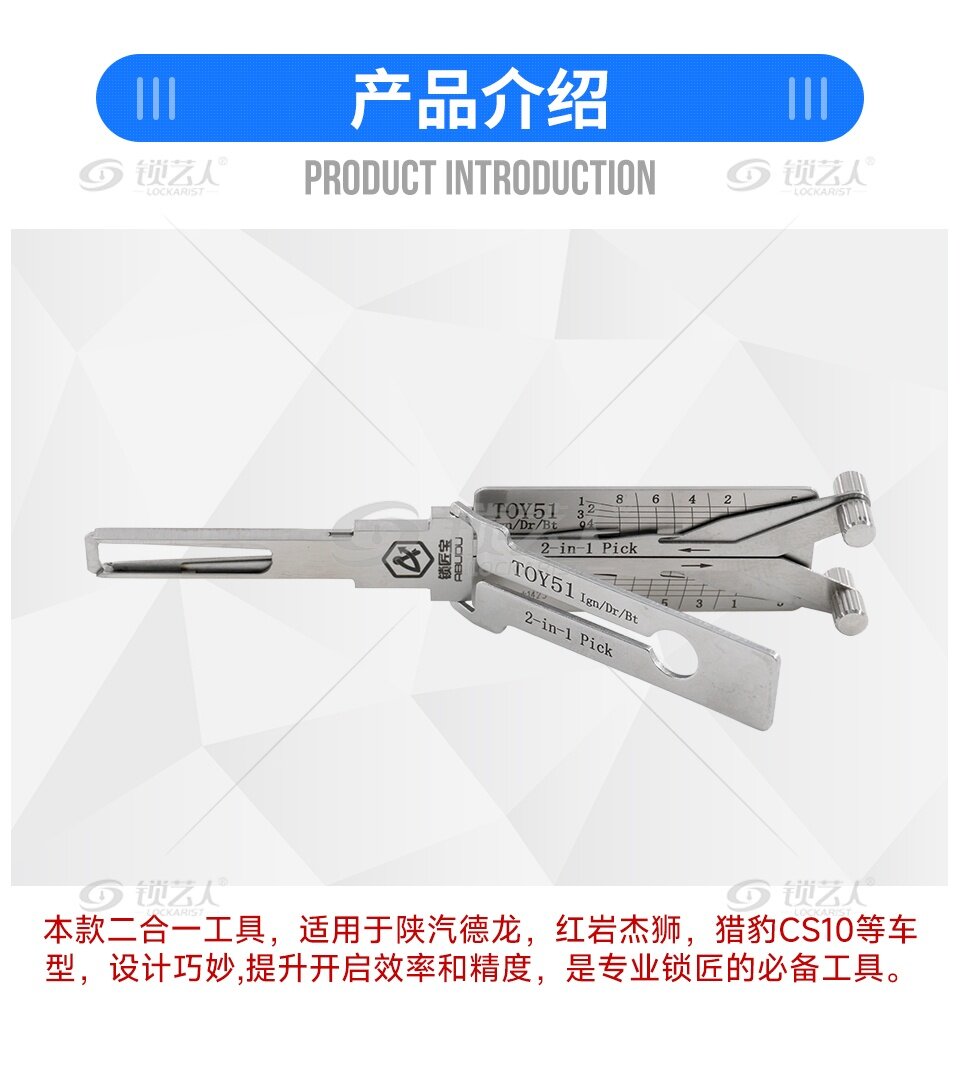 支持陕汽德龙、红岩杰狮、猎豹CS10 等车型的门锁、点火锁和后尾箱快速精准开启。工具采用高硬度合金钢制造,读齿与开启一体设计,配可视化刻度板操作,无需拆解锁芯即可读取锁芯数据,操作便捷耐用。 ABUDU/锁匠宝 TOY51内铣二合一工具,采用高硬度合金钢材质,适用于陕汽德龙,红岩杰狮,猎豹CS10等车型,提升开启效率和精度,是专业锁匠的必备工具。
