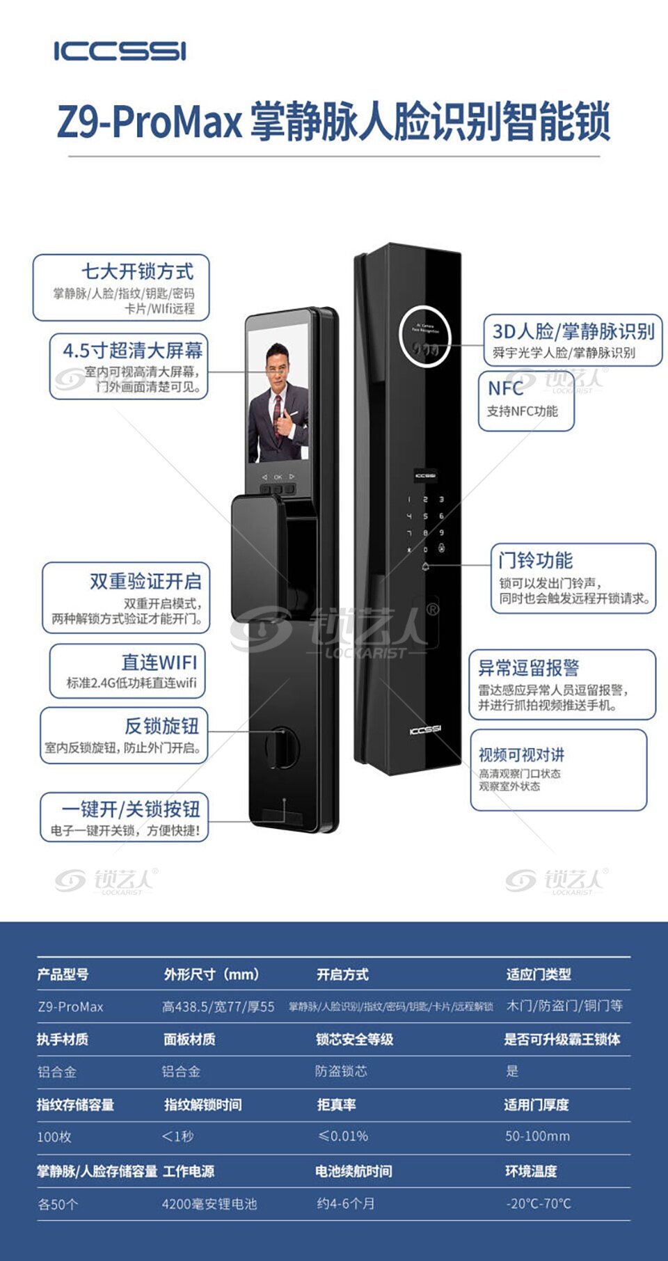 - 名称:ICCSSI-Z9-ProMax掌静脉人脸智能锁