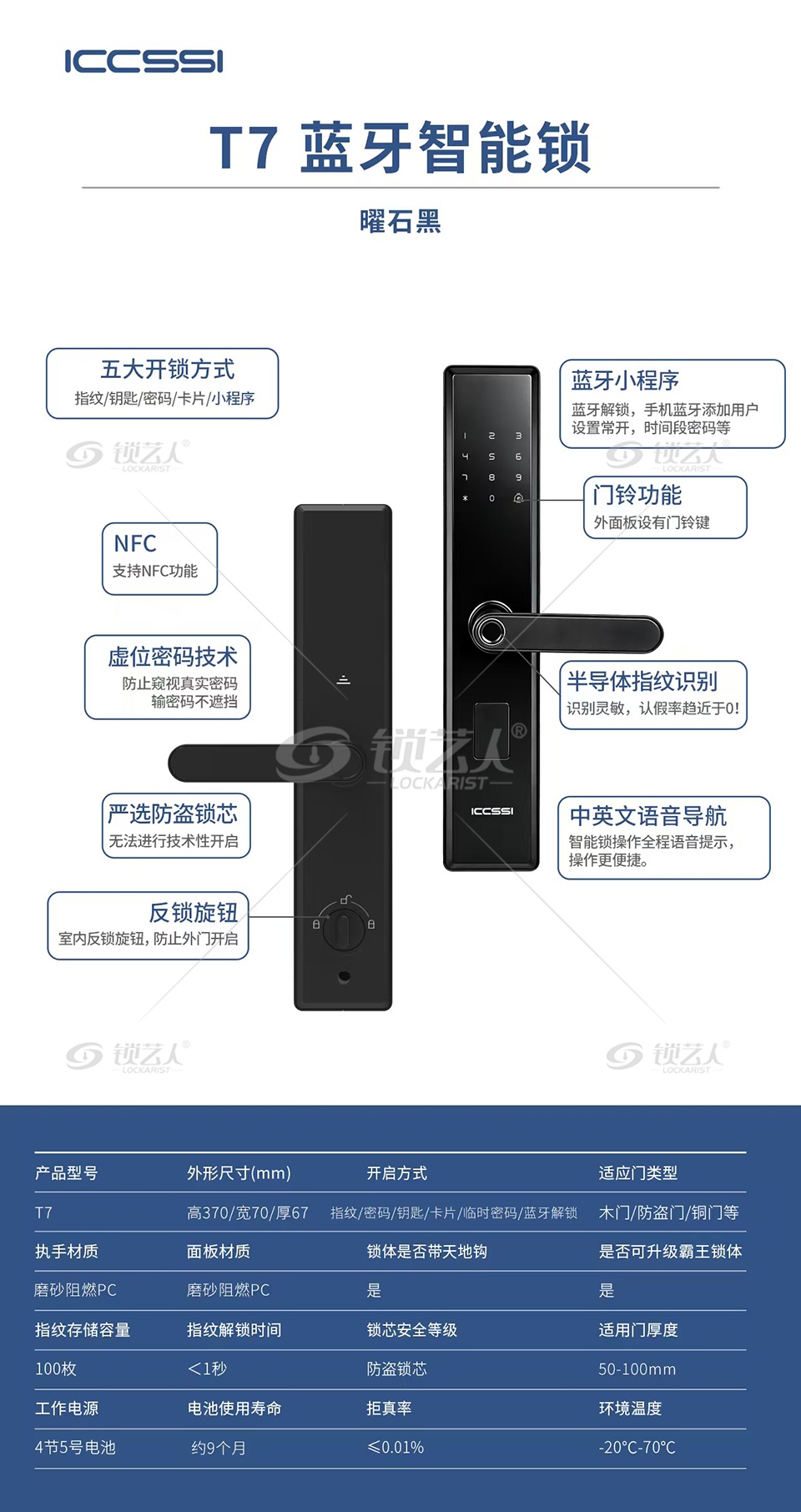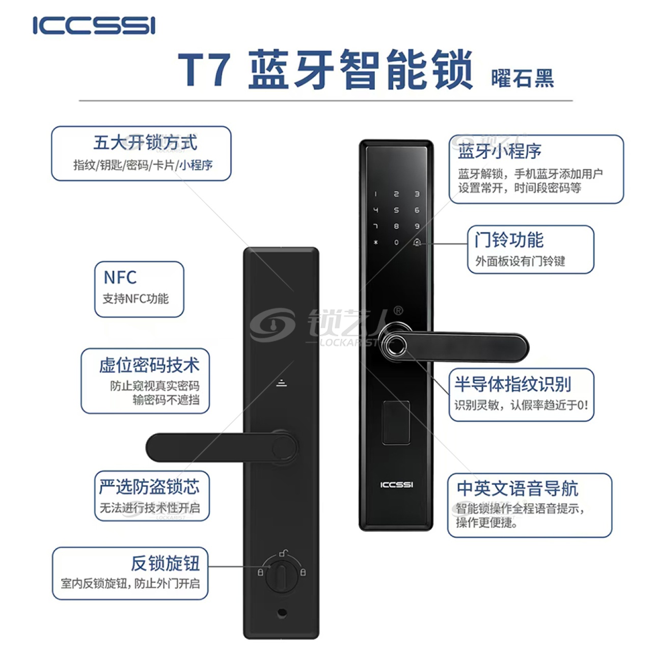 - 名称:艾栖ICCSSI-T7蓝牙智能一握开智能锁