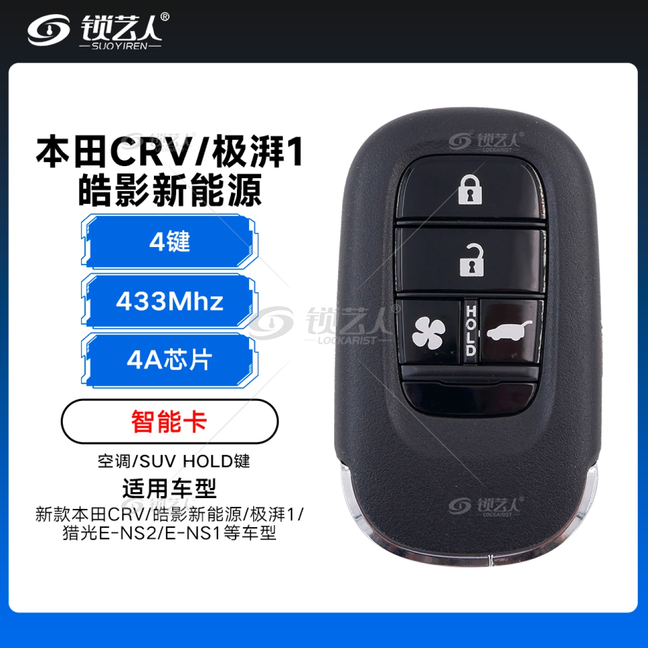 - 配备4个独立按键,解锁,锁车,空调和SUV后尾箱启动,适用于本田CRV、皓影新能源、极湃1、猎光E-NS2、E-NS1等车型,具备智能无钥匙进入与一键启动功能。