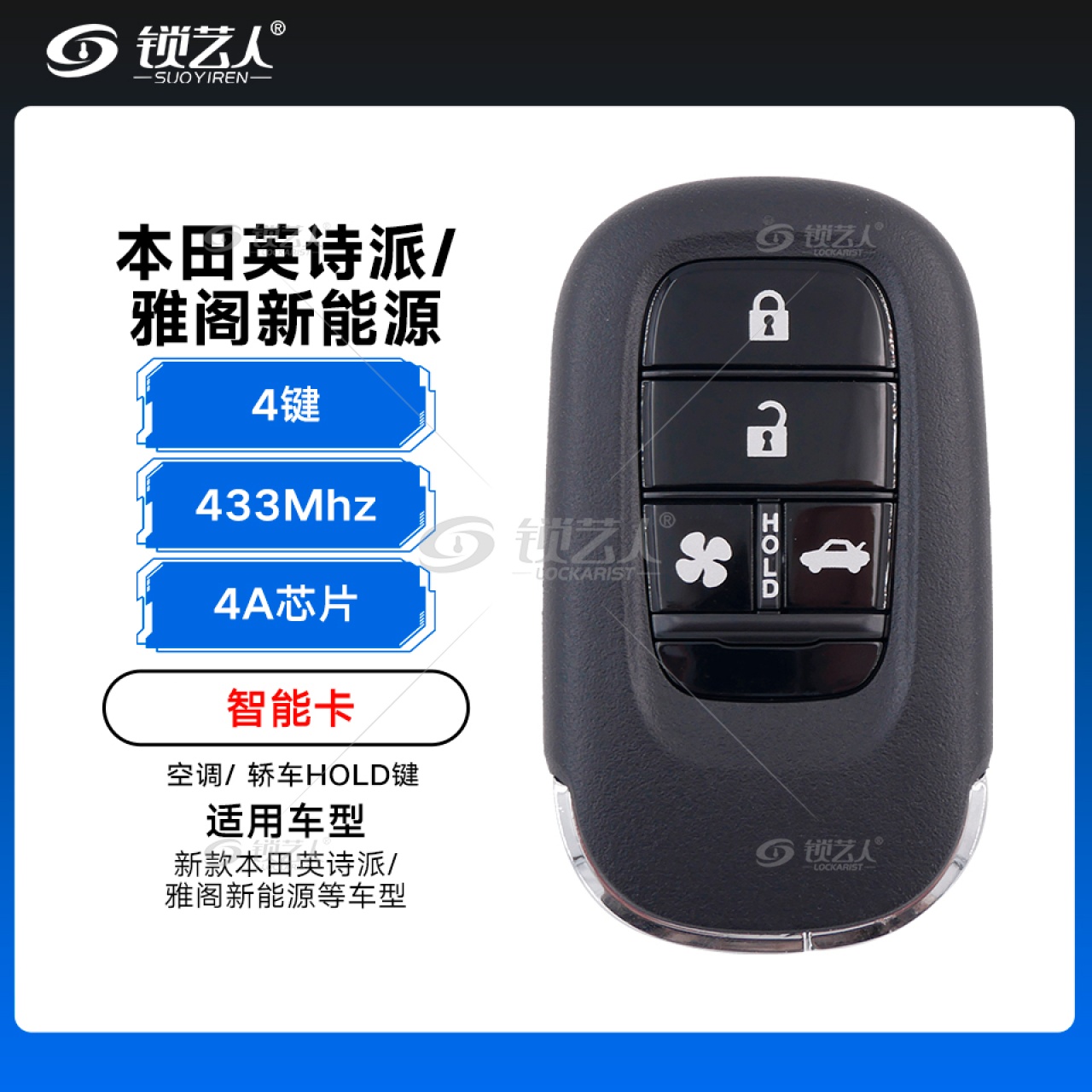- 配备4个独立按键,解锁,锁车,空调和轿车后尾箱启动,适用于本田英诗派、雅阁新能源等车型,具备智能无钥匙进入与一键启动功能。