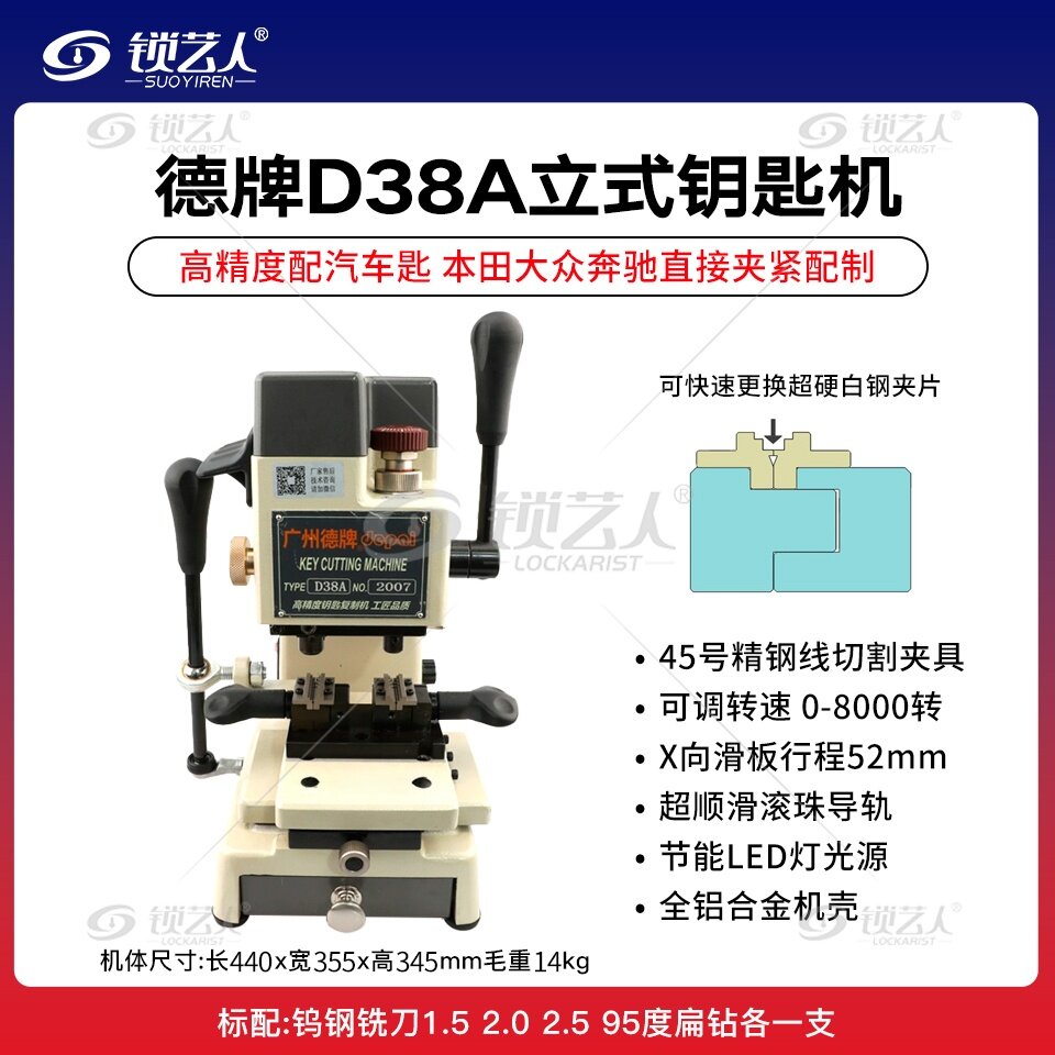德牌D38A型立式钥匙复制机,专为专业锁匠和汽车维修人员设计,具备本田、大众和奔驰钥匙的直接夹紧配制功能。该机采用45号精钢线切割夹具,可调转速范围为0-8000转,X向滑板行程为52mm,超顺滑的滚珠导轨配合节能LED灯光源,全铝合金机壳设计,使得整体设备更加坚固耐用。用户可以快速更换超硬白钢夹片,极大提高了设备的灵活性与工作效率。