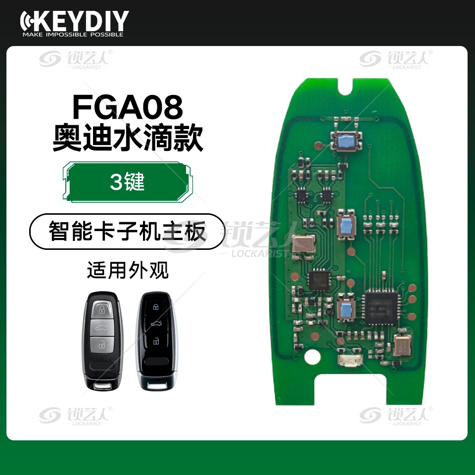 KD-FGA08水滴款智能卡子机PCB主板-3键:专为奥迪车型设计,支持钥匙生成、替换与维修,信号强、抗干扰性能优越,3键操作直观,专业锁匠首选工具。 由KEYDIY制造,适用于奥迪车型。支持钥匙生成、替换及维修等功能,采用高品质电子元件,信号稳定强劲,抗干扰性能出色。系统识别精准,编程速度快,三键布局设计简洁直观,操作高效便捷,满足专业锁匠的实际使用需求。