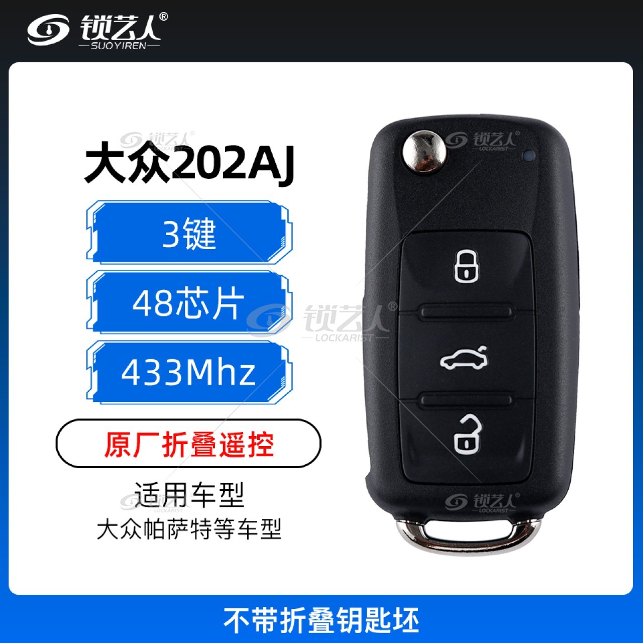 大众202AJ 753AG智能折叠钥匙-3键-433MHZ-48芯片-原厂适用于大众帕萨特等车型,直接使用设备上车匹配即可注意:配钥匙时需要把原厂钥匙拿开,没有智能的话需要多次匹配,有智能后即可