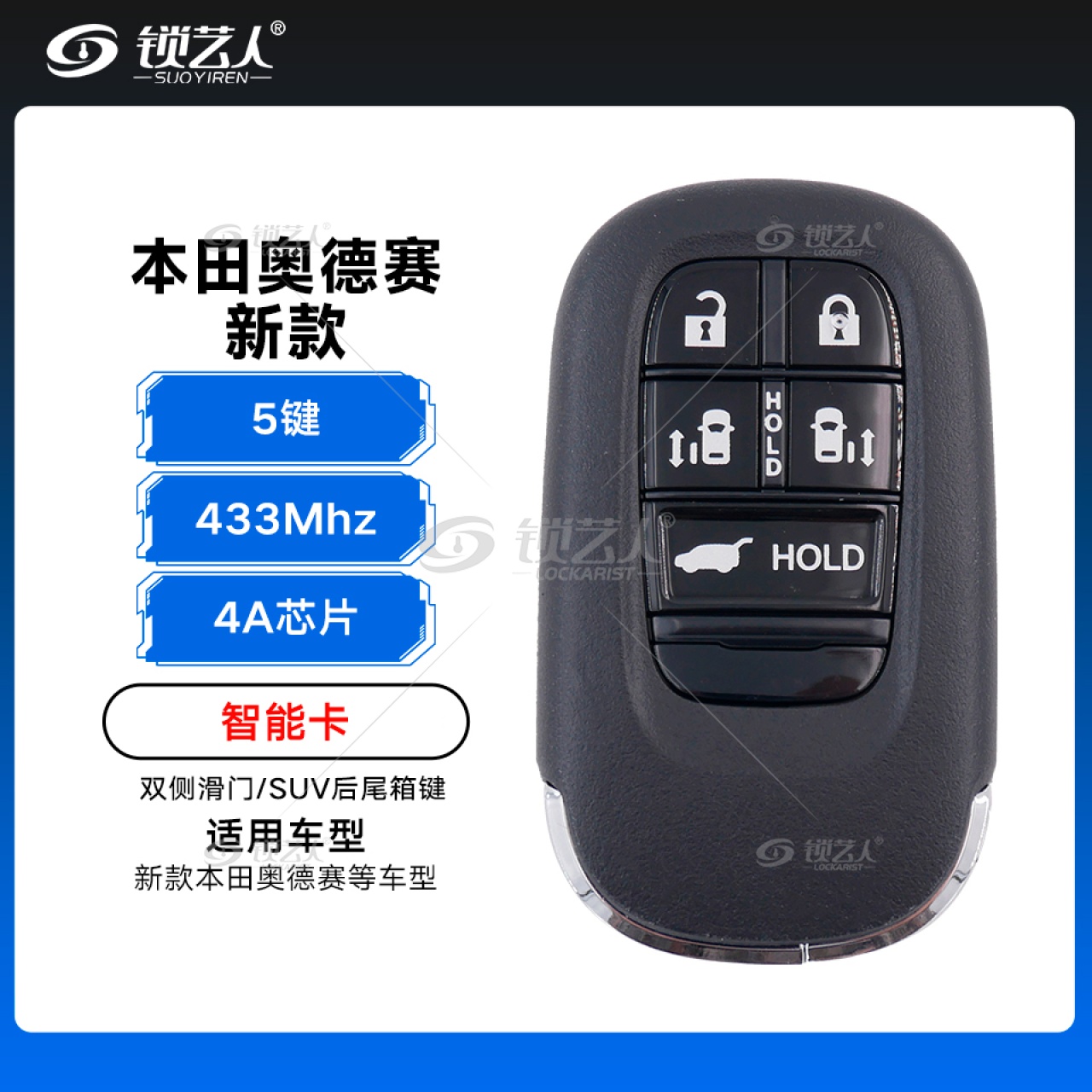 - 配备5个独立按键,解锁,锁车,双侧滑门和SUV后尾箱启动,适用于本田奥德赛等车型,具备智能无钥匙进入与一键启动功能。